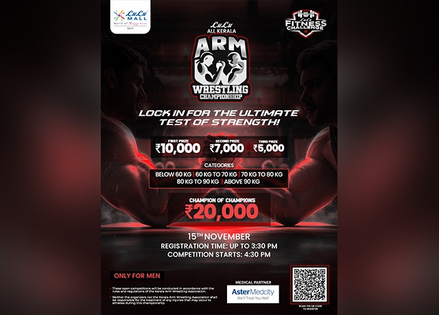 Glory belongs to the strongest! 🔥 Welcome to the LuLu All Kerala Arm Wrestling Championship, the ultimate showdown of strength and grit. Think you’ve got what it takes to take down the best? Register now and show your strength on 15th November at LuLu Mall, Kochi.